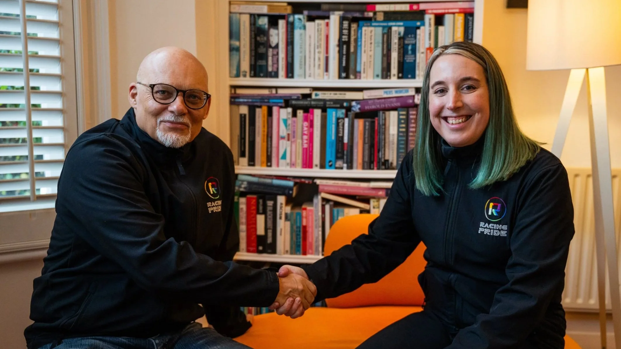 Matthew-Harriet Randall, Chief Executive Officer of Racing Pride (right), celebrates Racing Pride’s exciting new partnership with Diagonal Communications, the respected comms/PR agency led by its experienced Managing Director Matt Bishop (left).